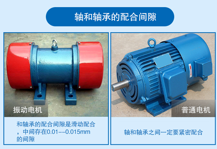 一、其實在振動電機的生產時,軸和軸承的配合間隙就和普通電機是不一樣的,普通電機的軸和軸承之間一定要緊密配合,而振動電機中軸和軸承的配合間隙是滑動配合,中間存在0.01--0.015mm的間隙,在維修時會感覺軸會產生左右串動。其實這個間隙配合是有著它的重要作用的。