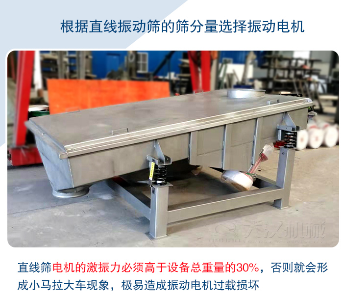 按照專業的計算方法來說,直線篩電機的激振力必須高于設備總重量的30%,否則就會形成小馬拉大車現象,極易造成振動電機過載損壞。。這里說的設備總重量指的是直線篩的減震彈簧以上的參振部分的總重量加上承載物料后的中重量,這樣才能保證篩面上的物料有充分的受力在篩面被拋起篩分。