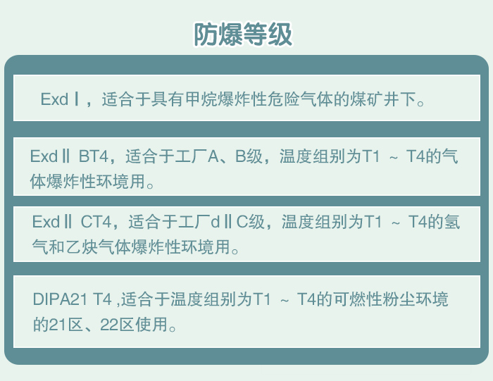防爆標志為DIPA21 T4適合于溫度組別為T1 ~ T4的可燃性粉塵環境的21區、22區使用。