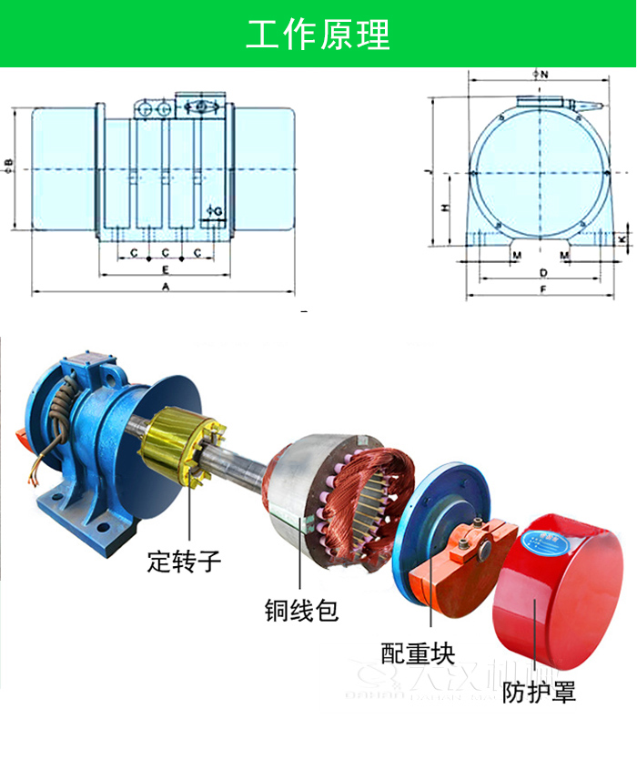 振動(dòng)電機(jī)的結(jié)構(gòu)由兩部分組成:一是專(zhuān)門(mén)設(shè)計(jì)的驅(qū)動(dòng)三相異步電動(dòng)機(jī)或單相電動(dòng)機(jī)部分,其原理與普通電機(jī)一樣,另一部分是具有偏心質(zhì)量,并可調(diào)節(jié)偏心距的激振機(jī)械部分。